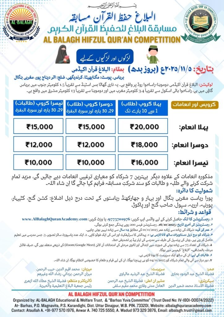 AL BALAGH Hifzul Quran Competition LogoThe AL BALAGH Hifzul Qur’an Competition is a noble initiative to encourage and honor young and adult memorizers of the Holy Qur’an. This competition aims to nurture love for the Qur’an, inspire accurate memorization with Tajweed, and create a platform for showcasing the remarkable talents of our Huffaz.